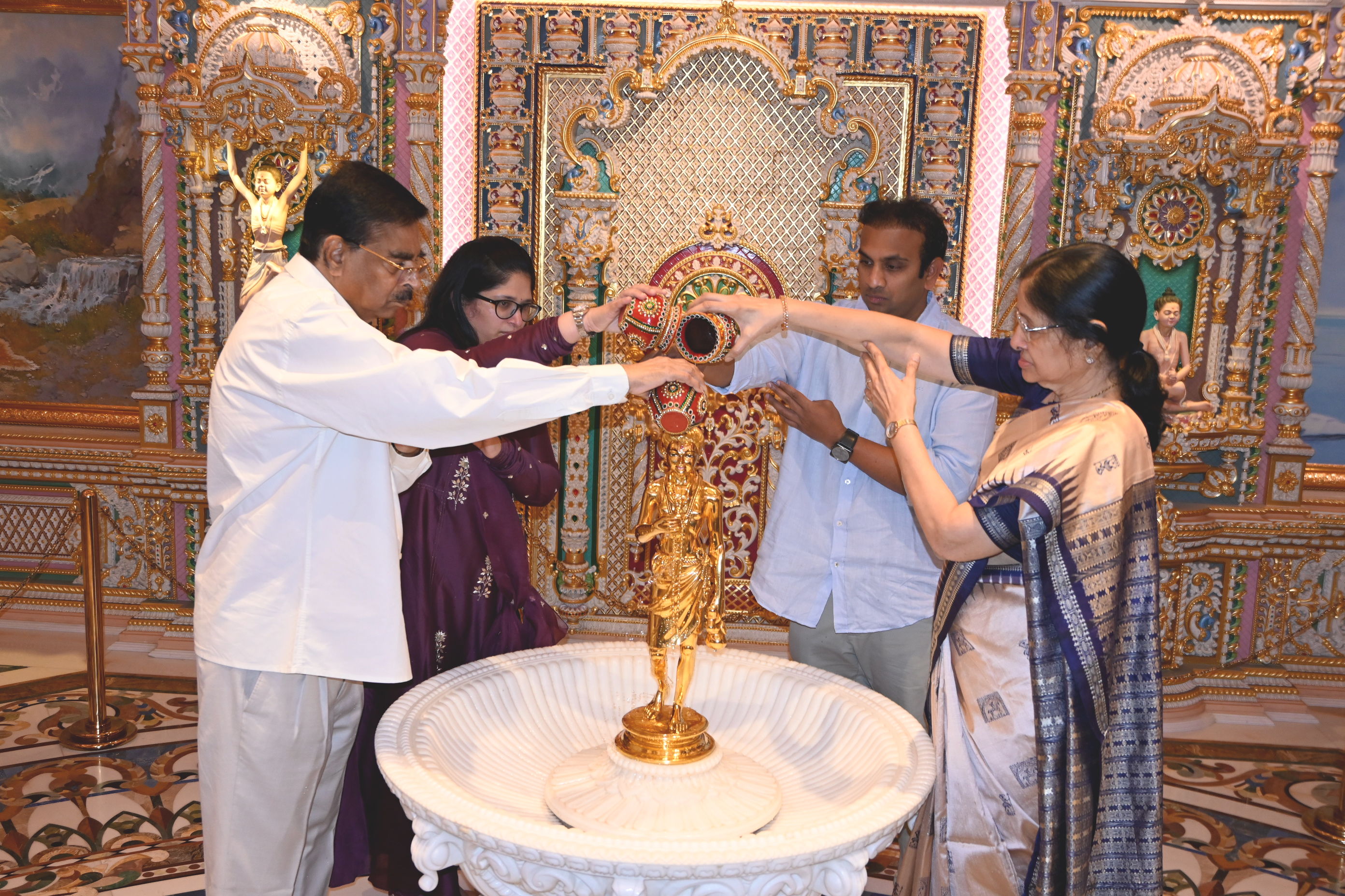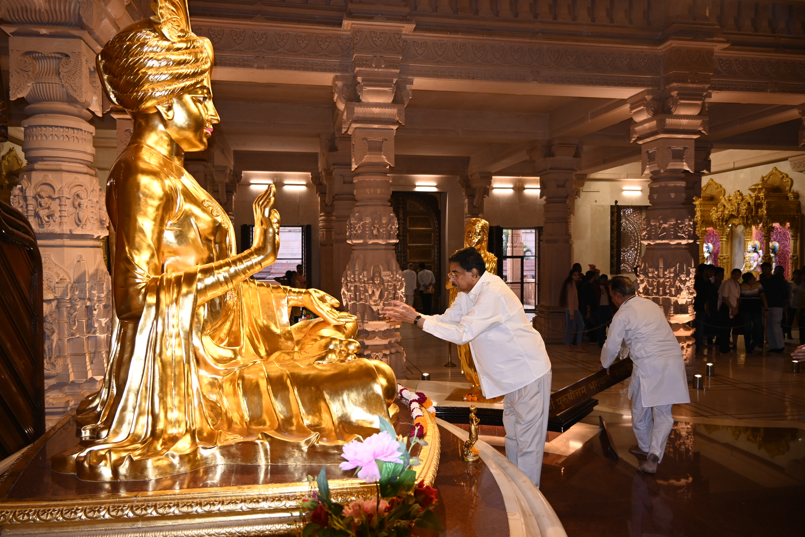 First, in the model room, the governor was introduced to the Akshardham complex, its creator Pramukh Swami Maharaj and his successor Mahant Swami Maharaj. Afterwards, he performed abhishek of Shri Nilkanth Varni Maharaj and offered his prayers for the progress of India and world peace.