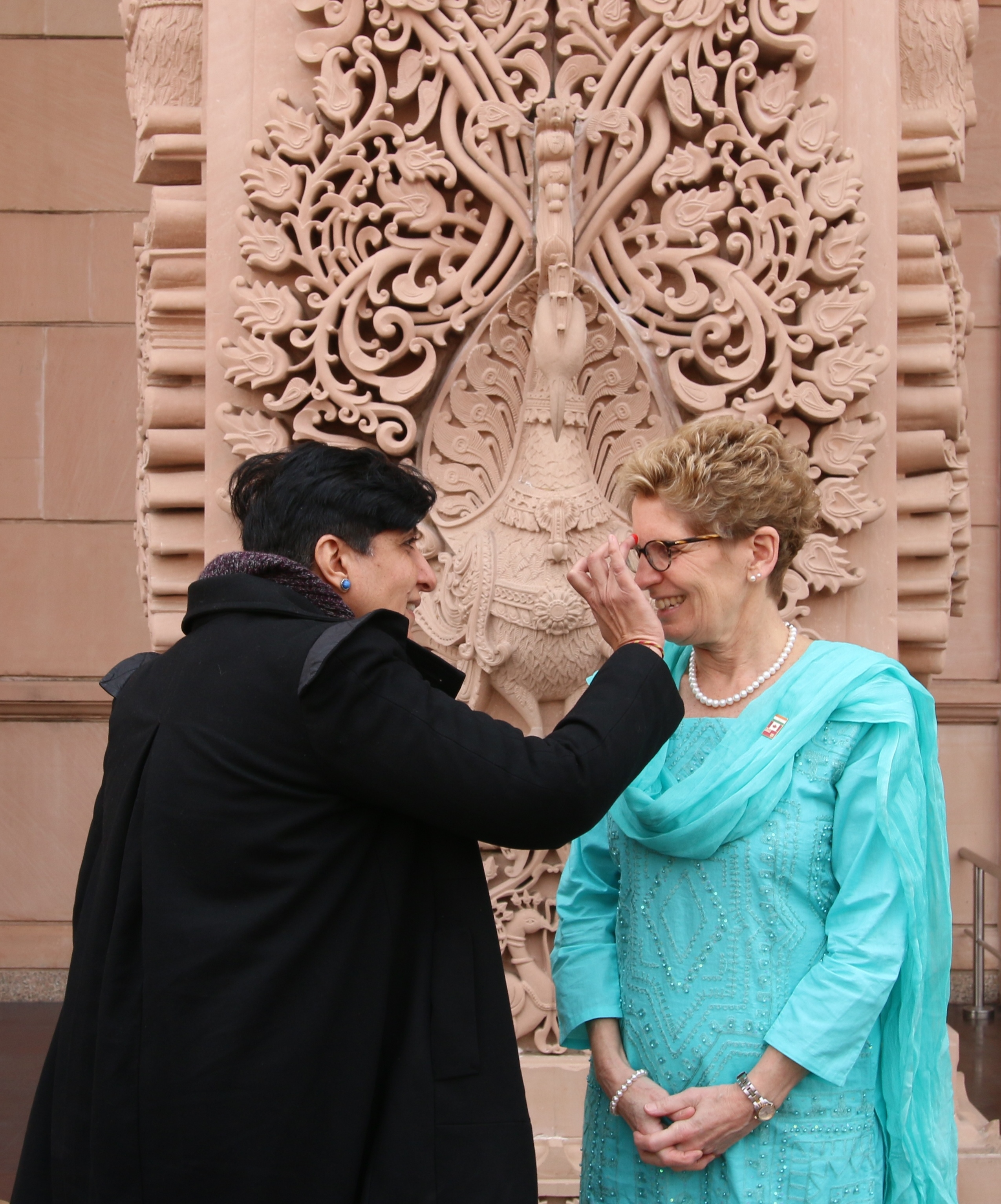 Premier Wynne was welcomed in a traditional Indian manner with a garland of flowers, a chandlo (vermillion powder) and the tying of the sacred kalva (sacred thread) by trustees and senior volunteers on behalf of Swaminarayan Akshardham and BAPS Swaminarayan Sanstha.