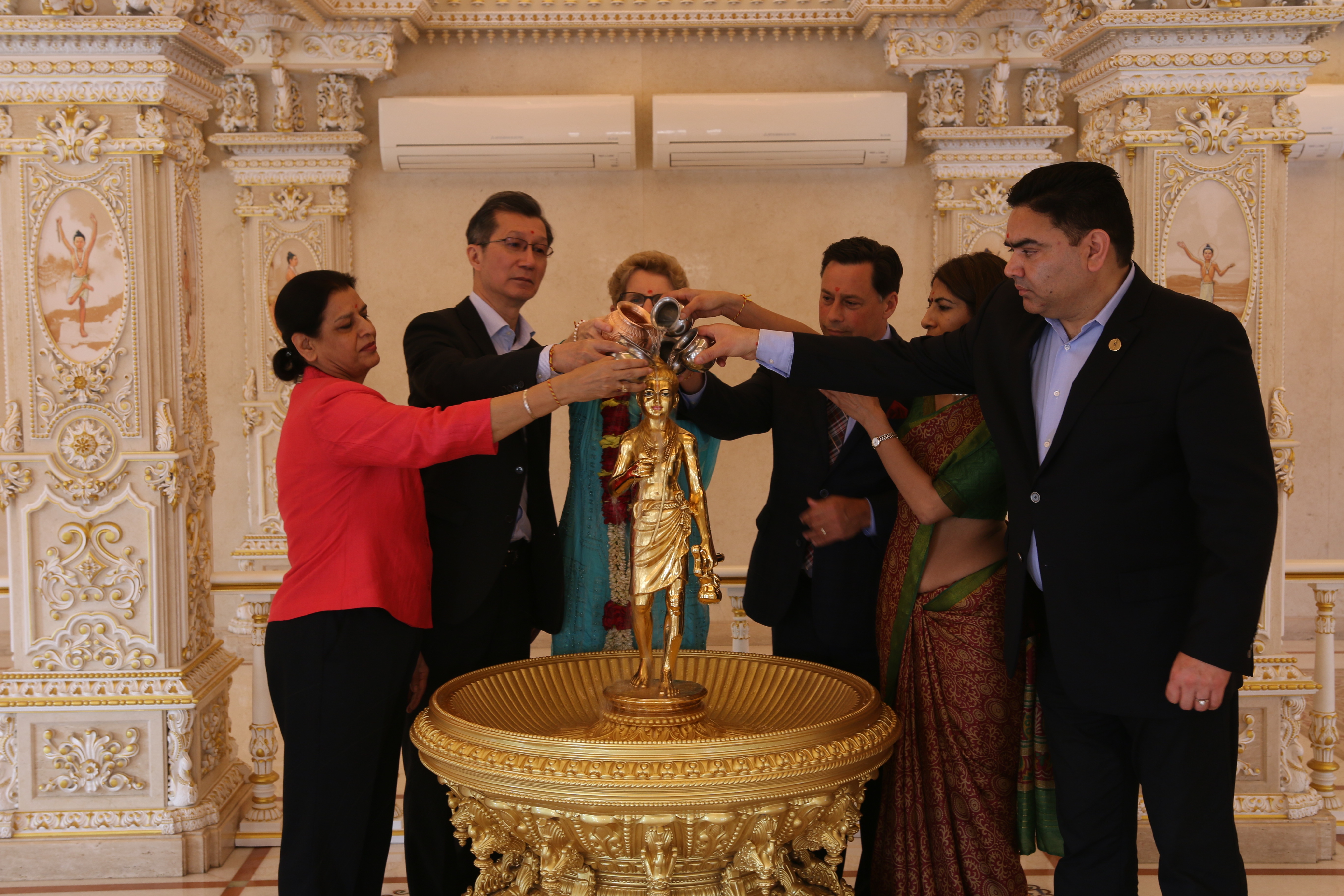 After offering respects and viewing the mandir’s architecture, the delegation visited the Gajendra Pithika (Elephant Plinth) that includes 148 life-sized carved stone elephants depicting message of social harmony, peace and spirituality.