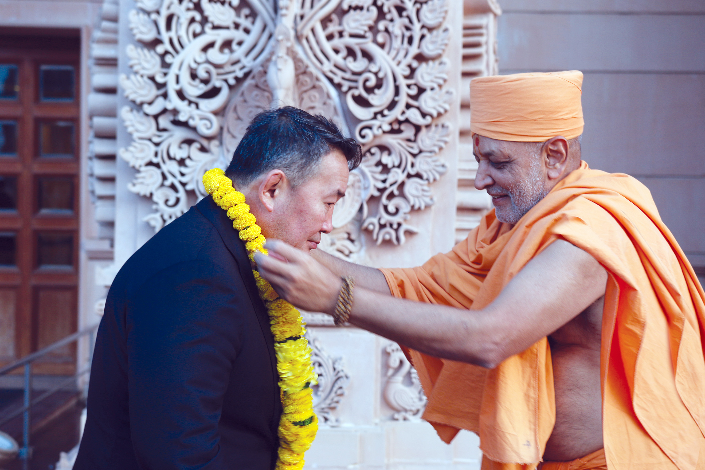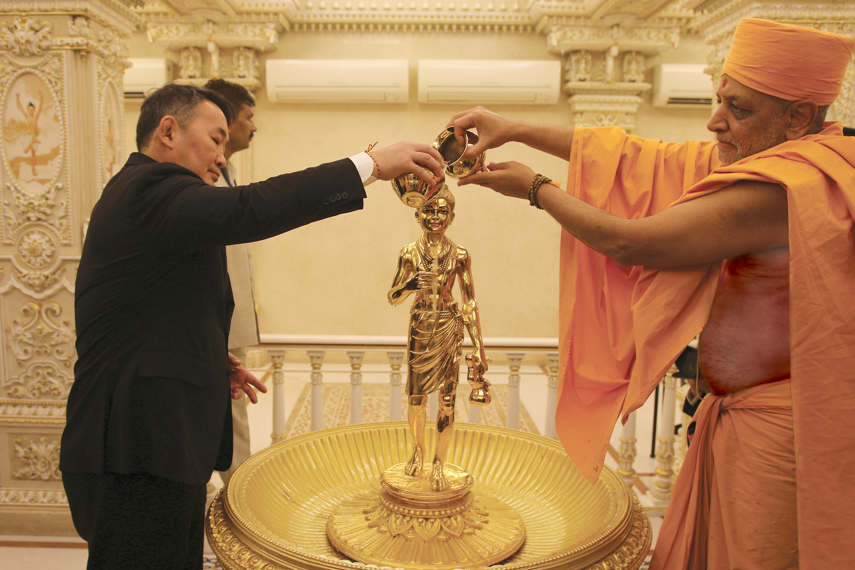 President Battulga, along with his delegation, which included members of his family, parliament officials, government representatives and advisors, were greeted by Dharmavatsal Swami of BAPS on behalf of Param Pujya Mahant Swami Maharaj, the sixth spiritual leader of BAPS.