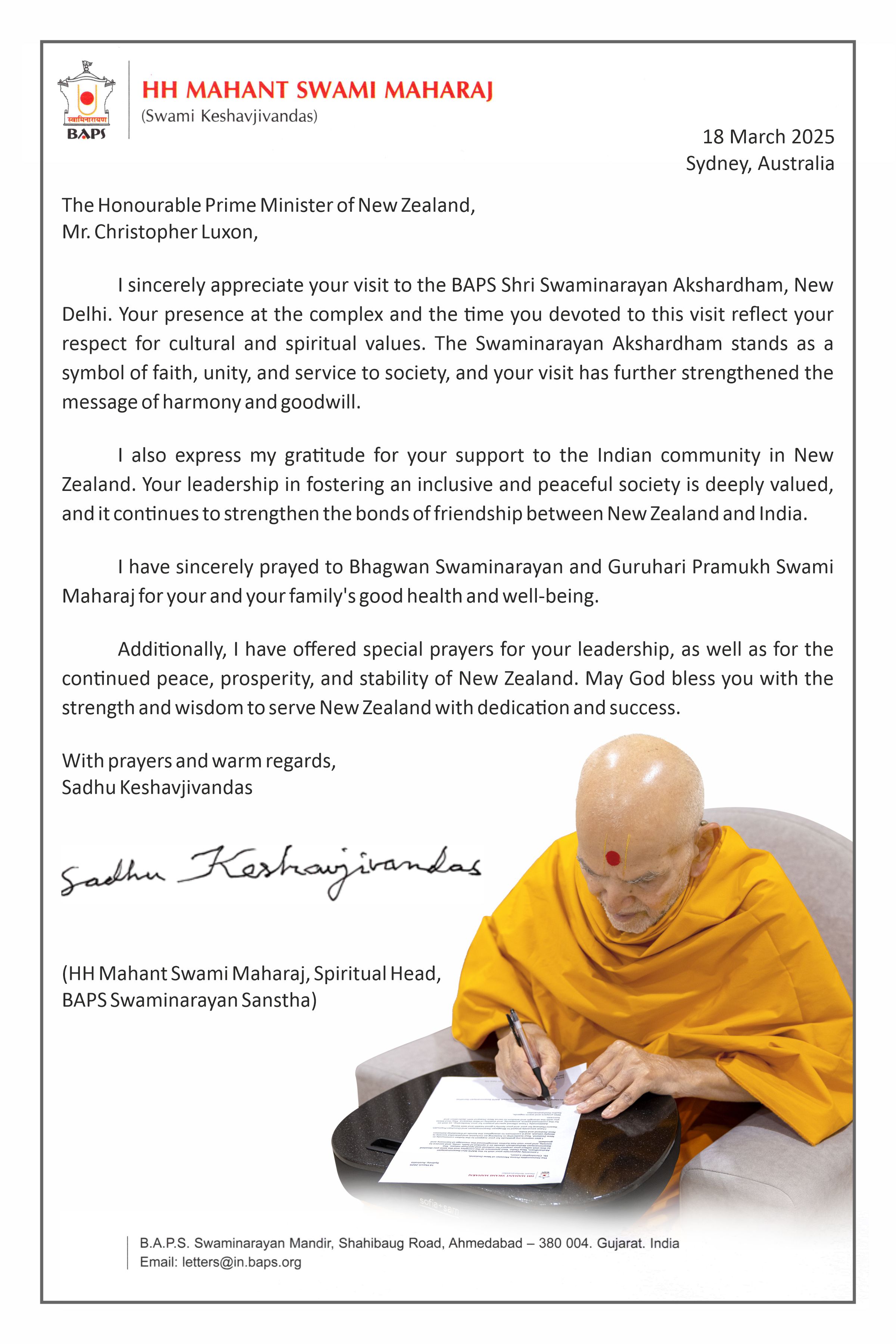 His Holiness Mahant Swami Maharaj, currently in Sydney, Australia, conveyed a heartfelt message to Prime Minister Luxon in a personal letter: