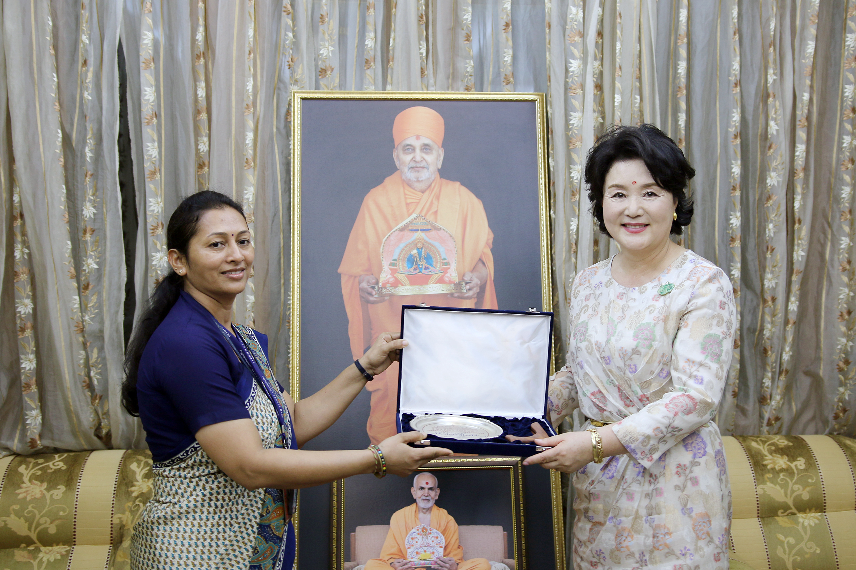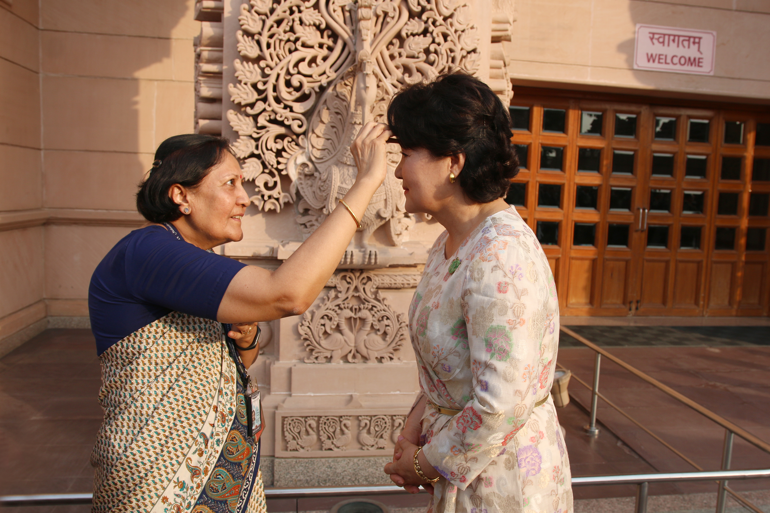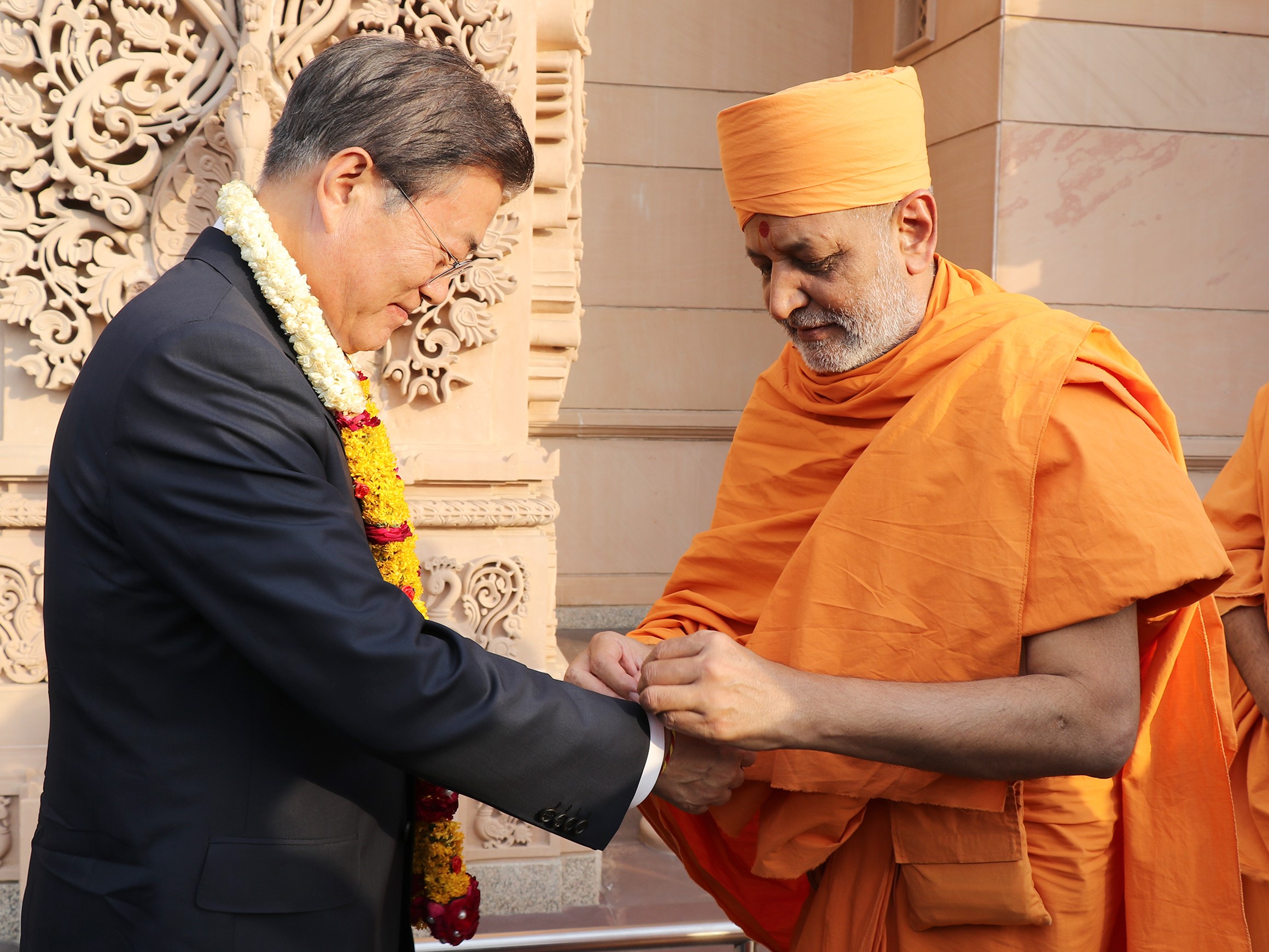 On behalf of His Holiness Mahant Swami Maharaj, the Spiritual Head of Swaminarayan Akshardham and the BAPS Swaminarayan Sanstha, senior sadhus and trustees traditionally welcomed President Moon and delegation by offering a garland of flowers, applying tilaka (vermillion powder) and tying the kalava (sacred thread) on their wrists.