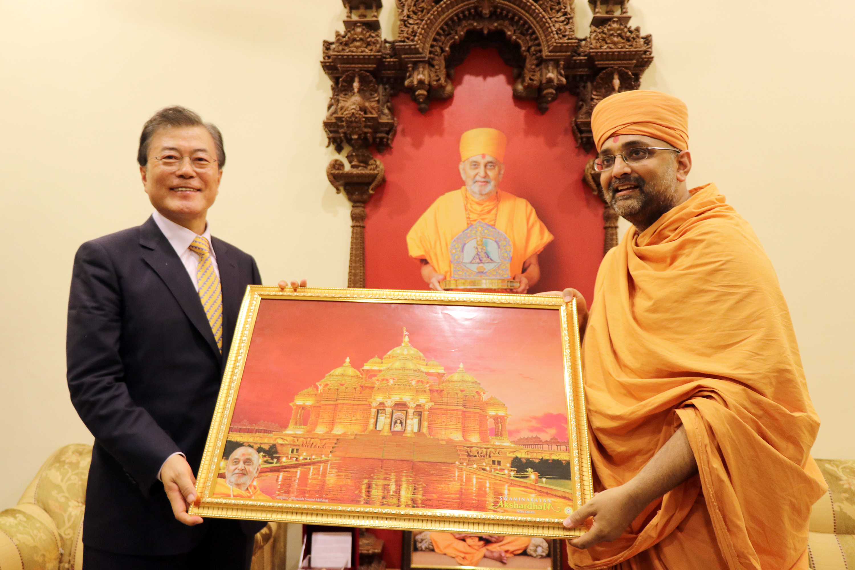 While traveling passed Akshardham on the Delhi Metro the following day, President Moon fondly reminisced with Indian Prime Minister Narendra Modi about his first visit in India at Swaminarayan Akshardham in New Delhi.