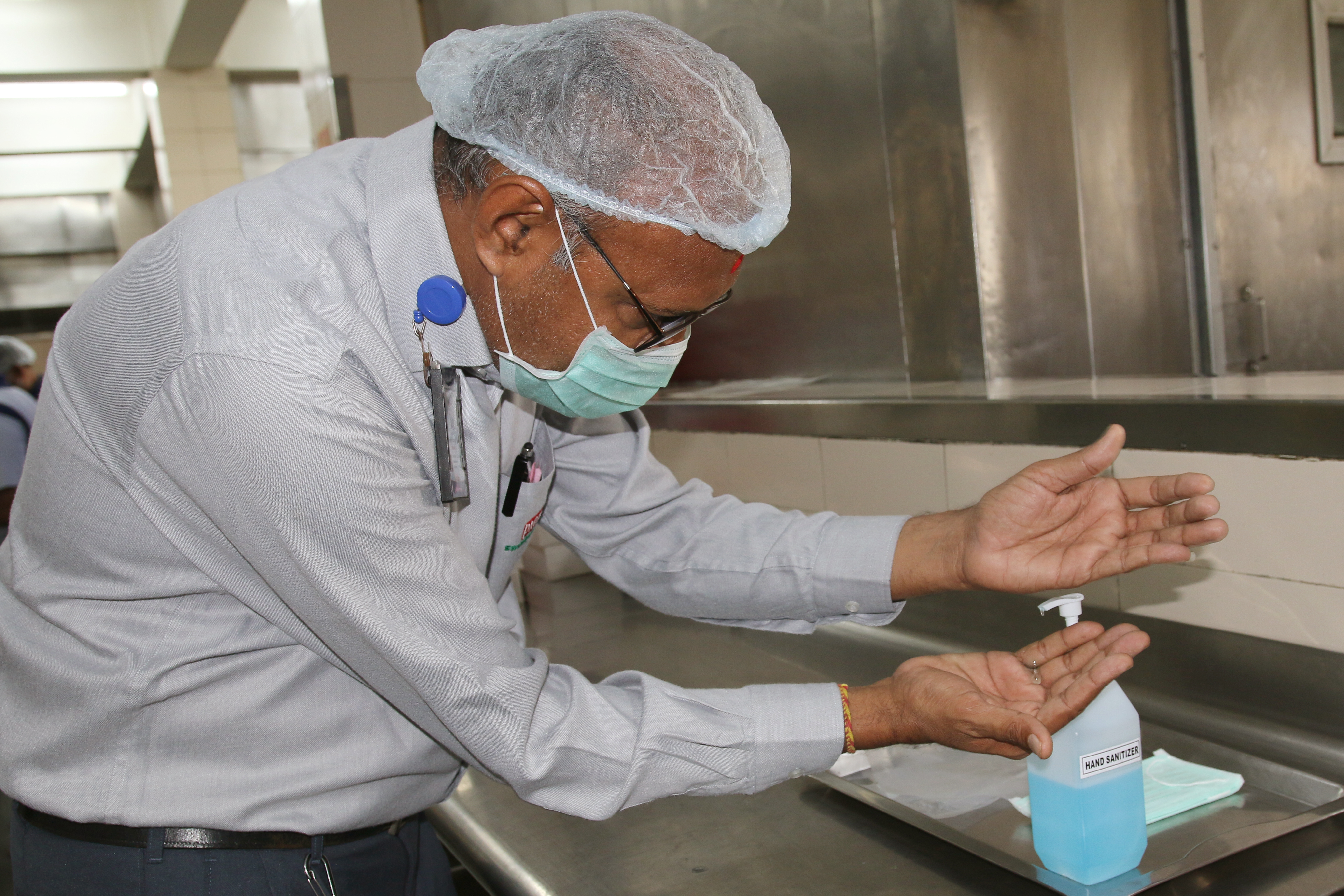 Volunteer sanitizes before preparing hot food packets for New Delhi's poor and needy affected by the Coronavirus Pandemic