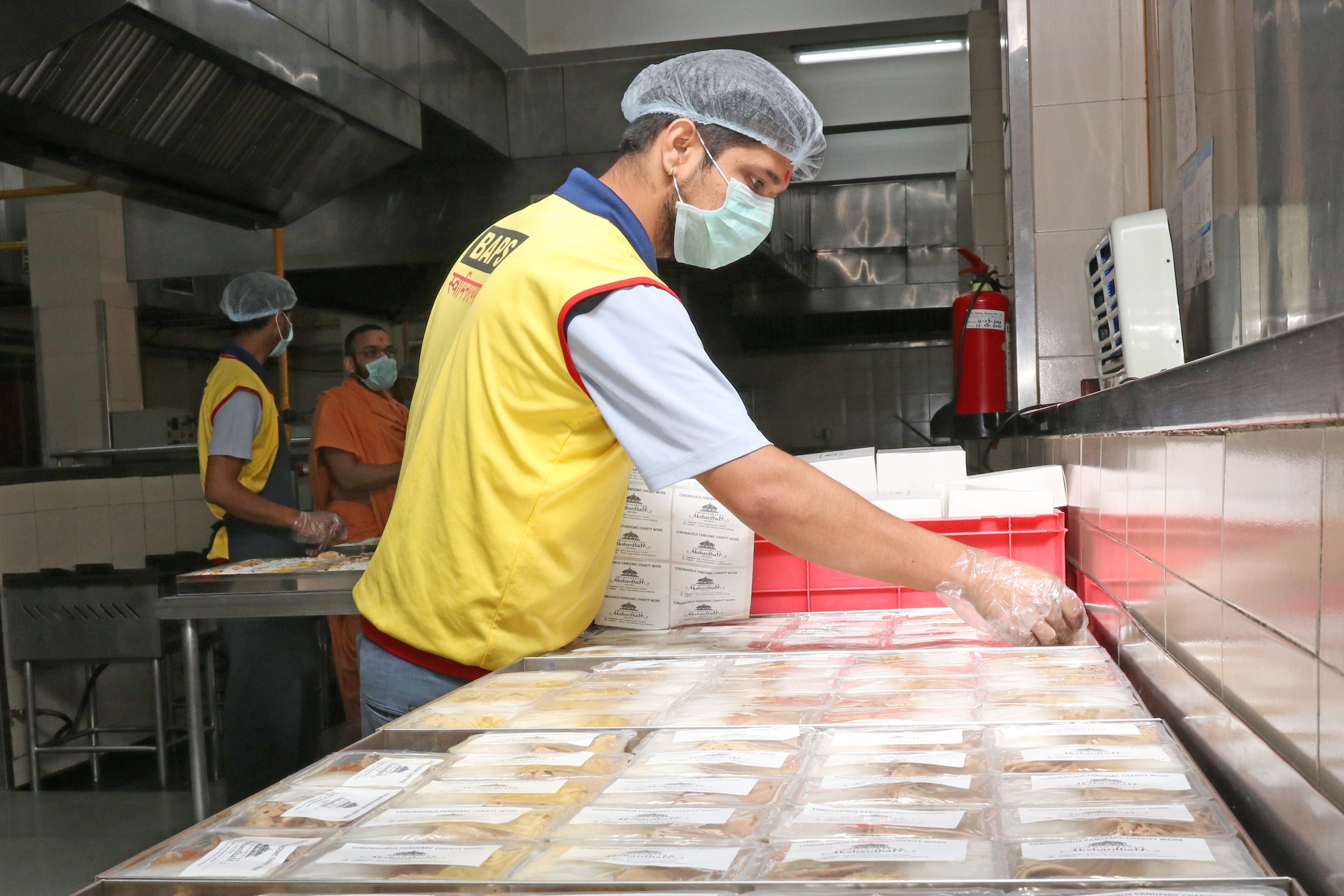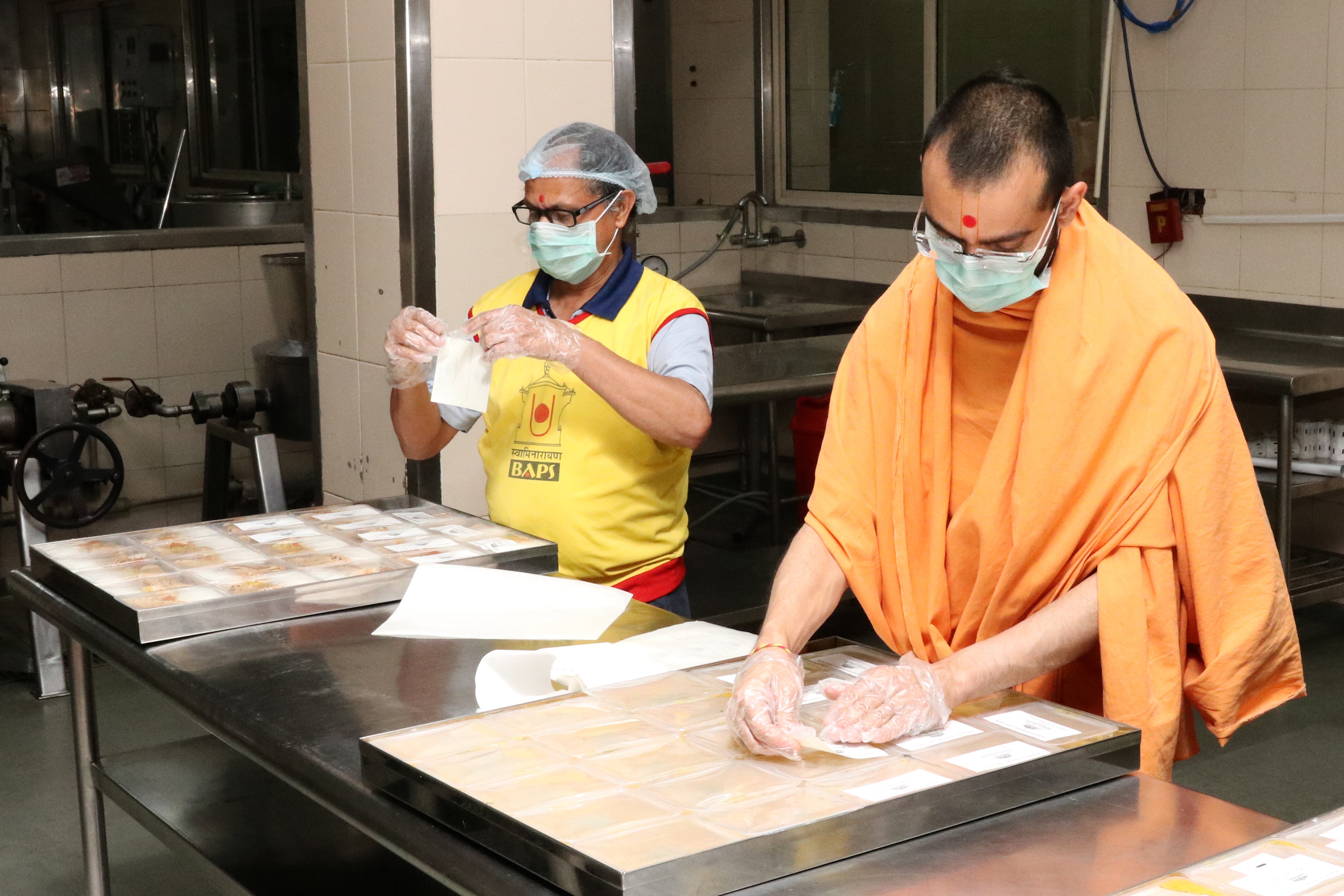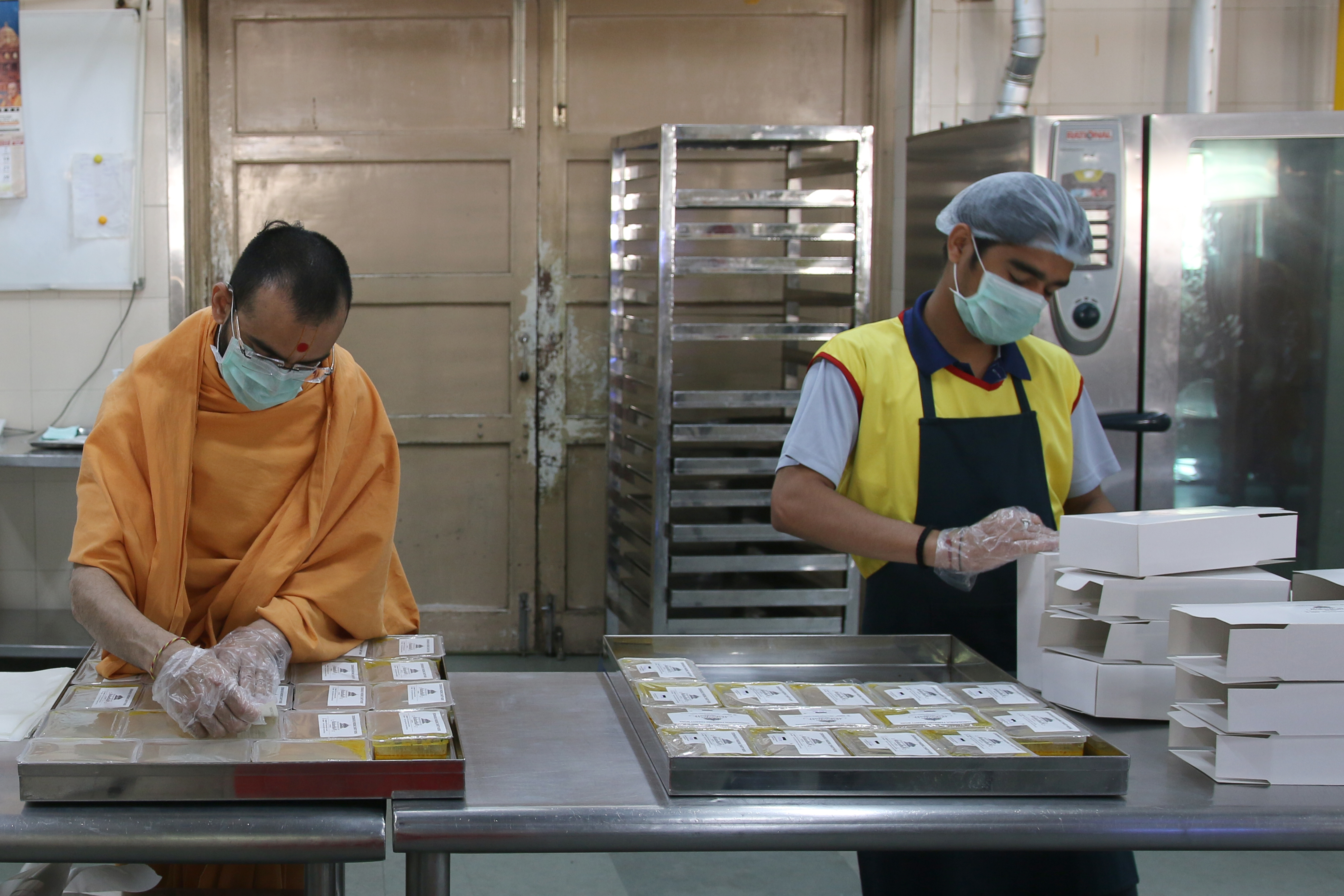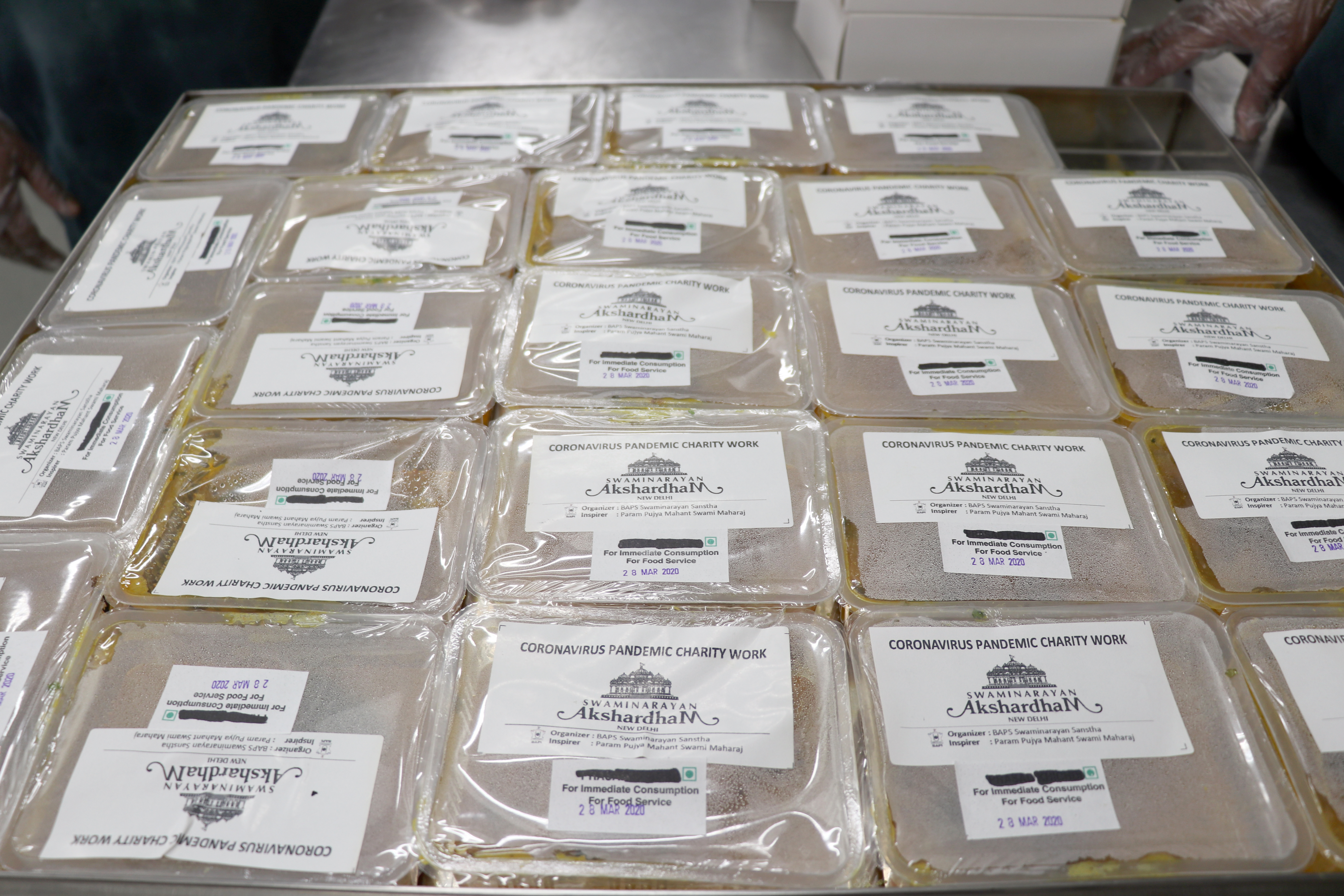 Prepared hot food packets by Swaminarayan Akshardham for New Delhi's poor and needy affected by the Coronavirus Pandemic
