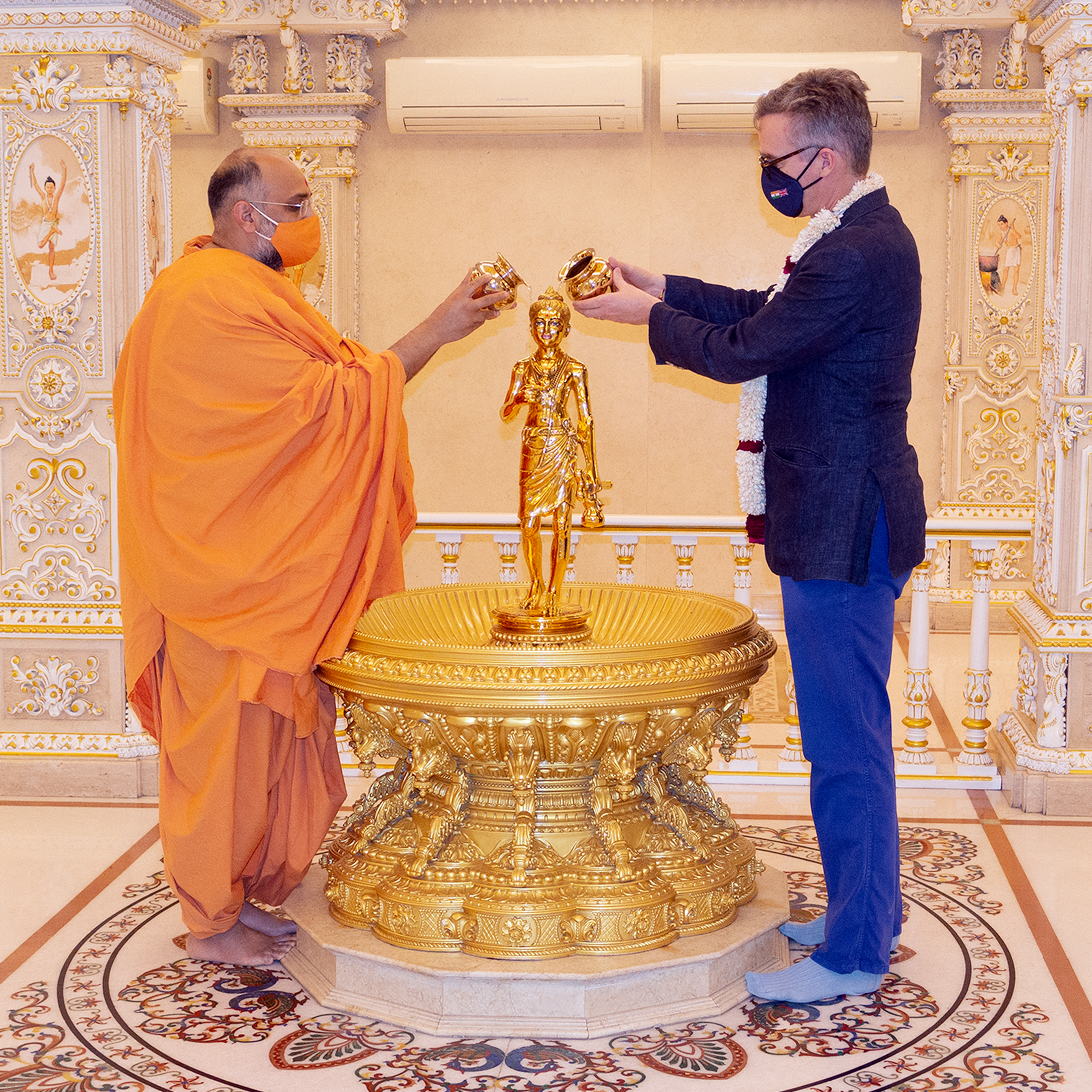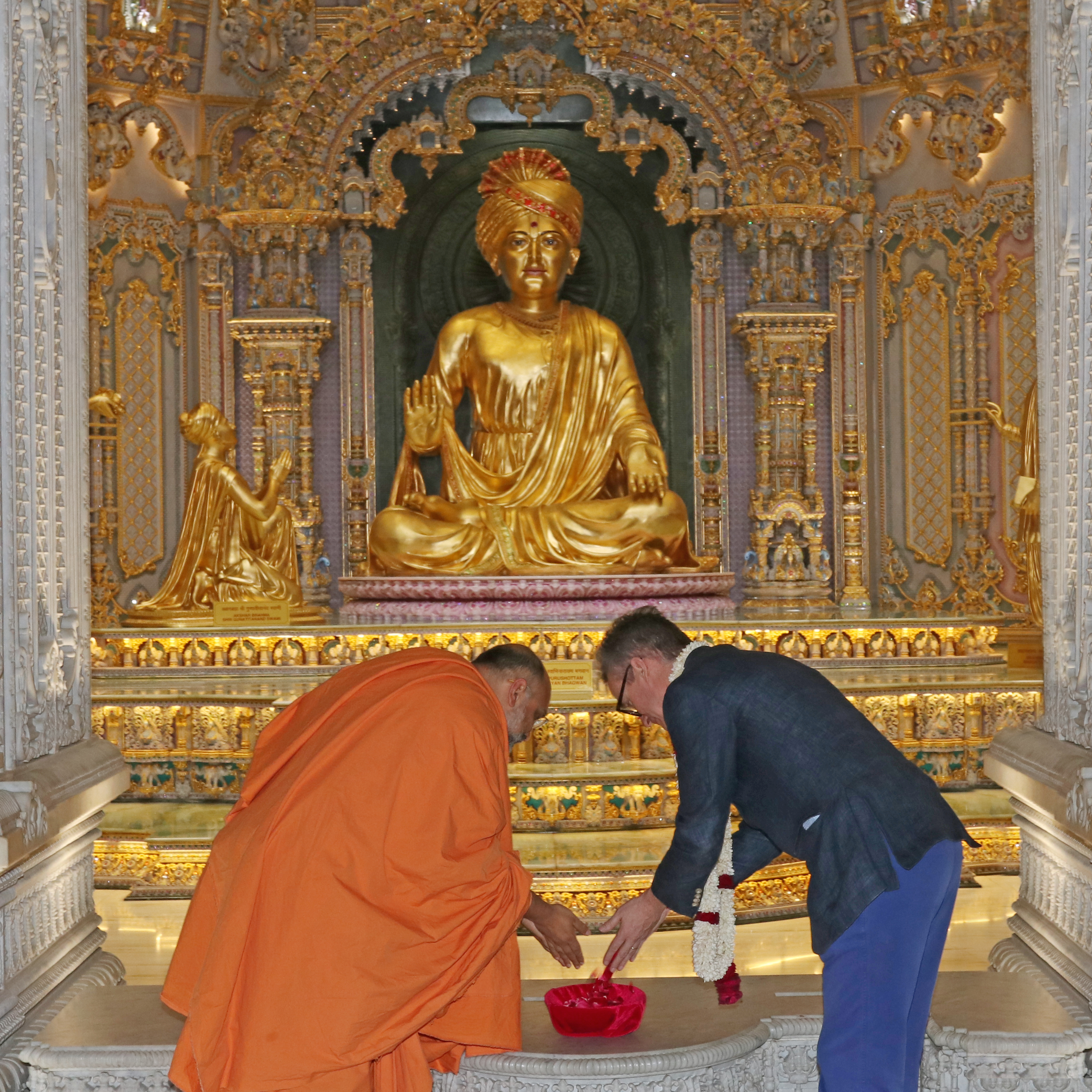 High Commissioner Ellis offered his respects at the Swaminarayan Akshardham Mandir and performed abhishek, the ceremonial pouring of sanctified water from 151 holy bodies of water on the murti of Shri Neelkanth Varni.