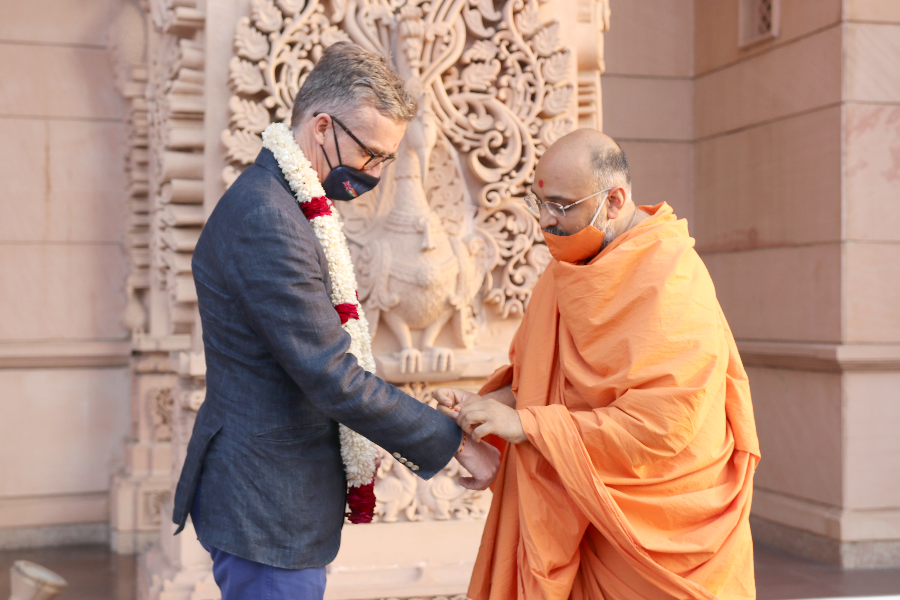 The U.K. High Commissioner to India Alex Ellis visited Swaminarayan Akshardham in New Delhi on Sunday, signifying the deep relationship between BAPS Swaminarayan Sanstha (BAPS) and the United Kingdom. High Commissioner Ellis was appointed to his position earlier this month, and his visit to Akshardham comes soon after his family’s arrival to India. High Commissioner Ellis was traditionally welcomed by Gnanmunidas Swami on behalf of Param Pujya Mahant Swami Maharaj, the spiritual leader of BAPS.