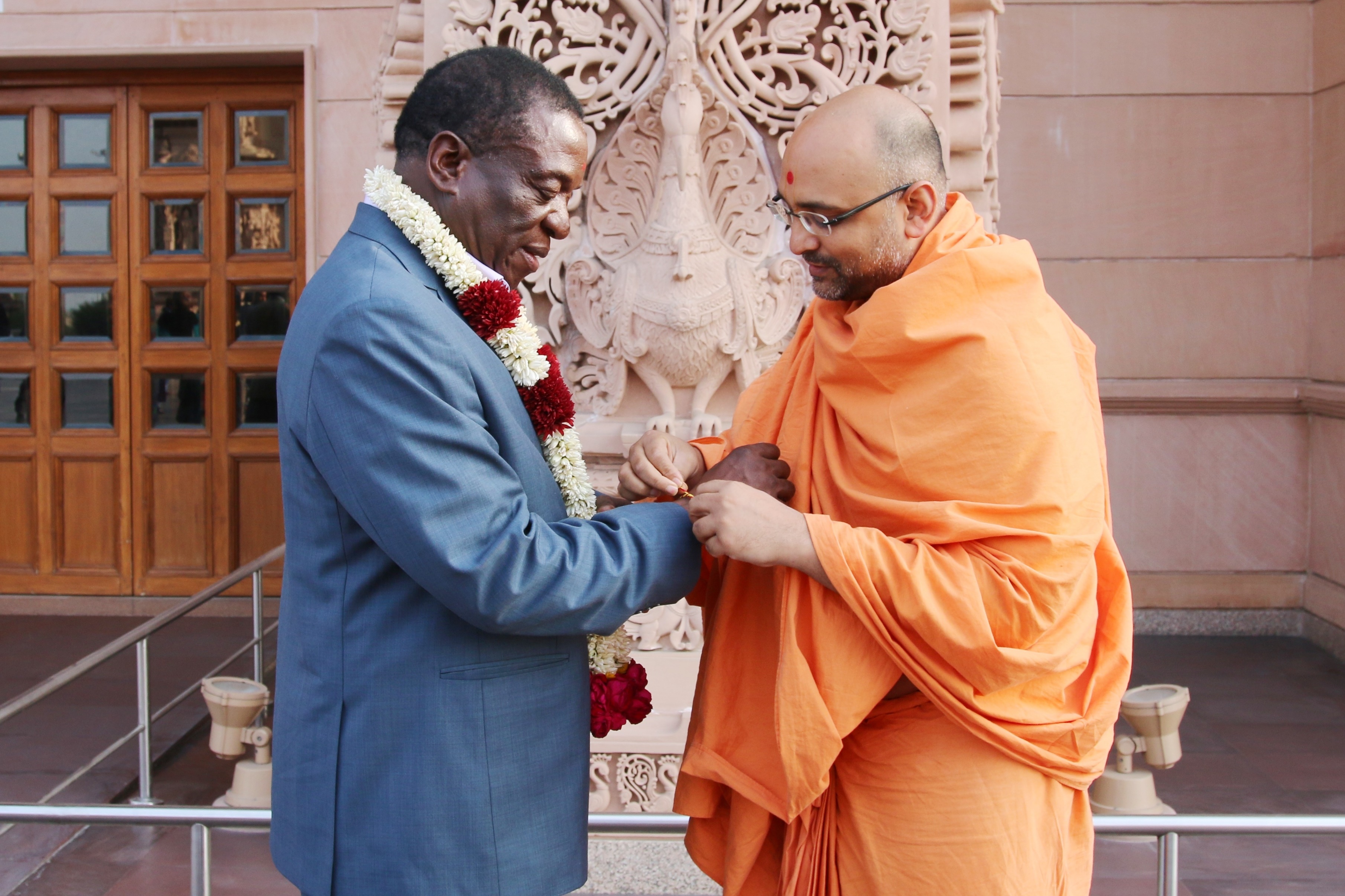 On behalf of His Holiness Mahant Swami Maharaj – Spiritual Head of Swaminarayan Akshardham and BAPS Swaminarayan Sanstha – senior sadhus traditionally welcomed Zimbabwe Vice President Mnangagwa with a garland of flowers, tilaka (vermillion powder) and the tying of the sacred kalva (sacred thread).