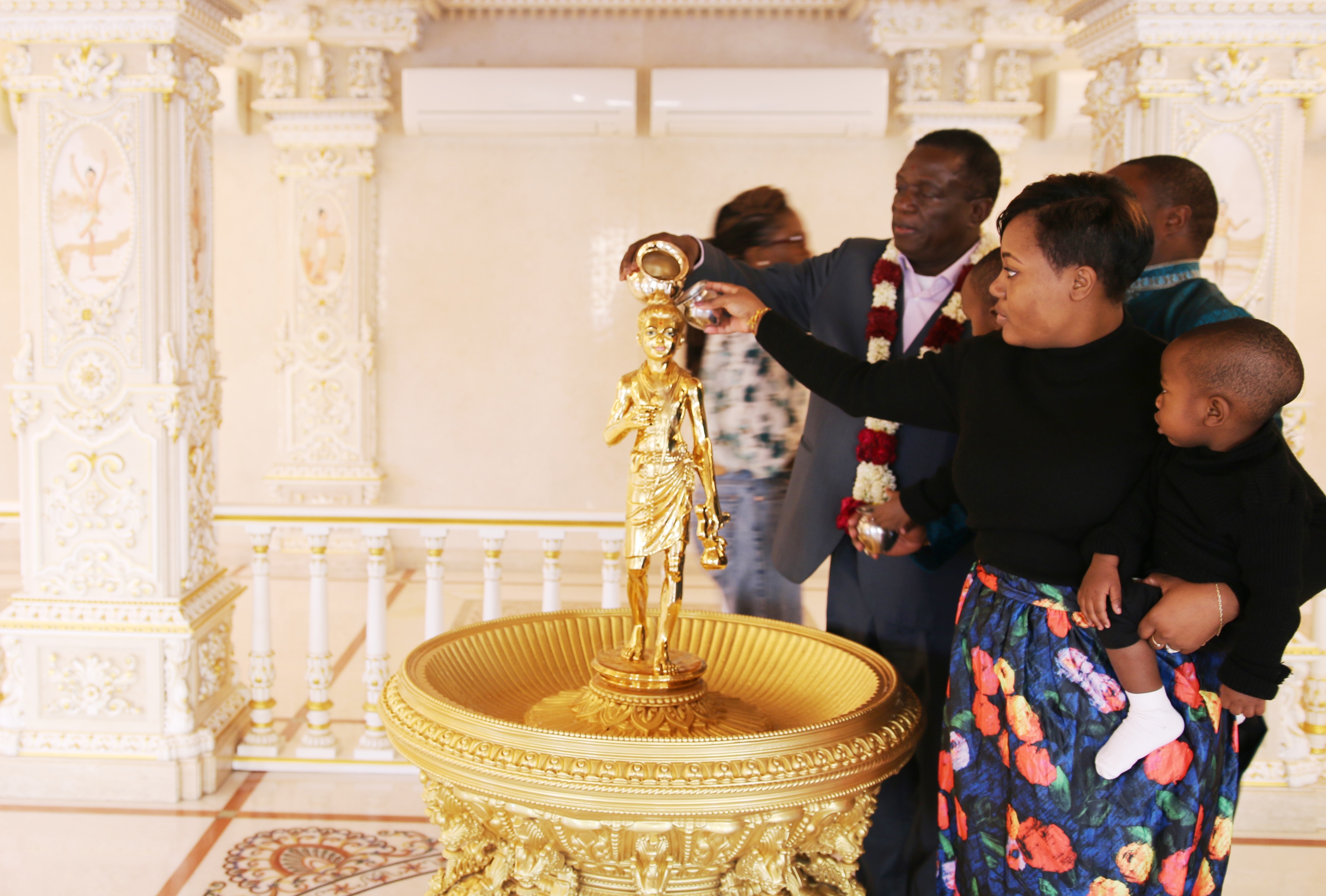 Vice President Mnangagwa and family offered prayers for world peace and harmony by offering ‘abhishek’, the ceremonial pouring of sanctified water from 151 holy rivers, lakes and ponds across India on the sacred image of Sri Neelkanth Varni.